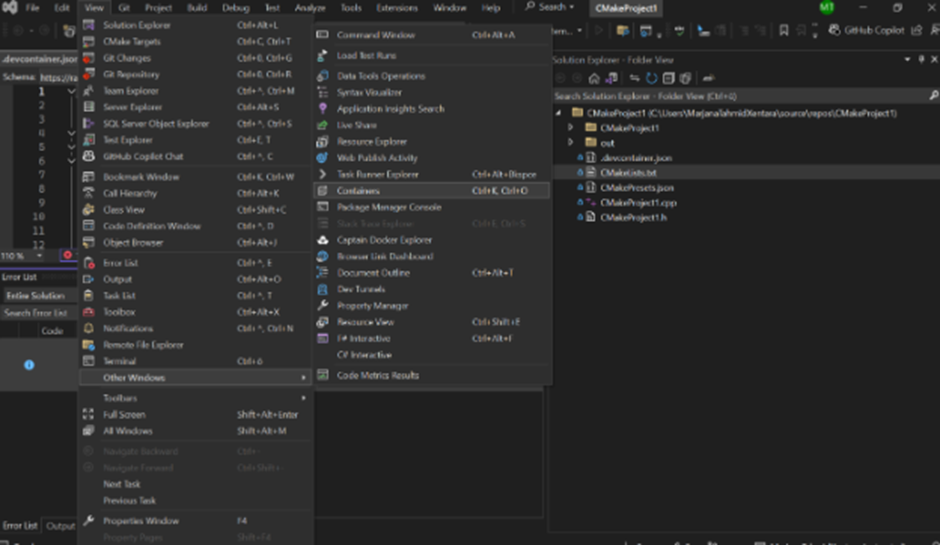 Or to check the container in Visual Studio Community, go to View, then Other Windows, and under Other Windows, Click on Containers.